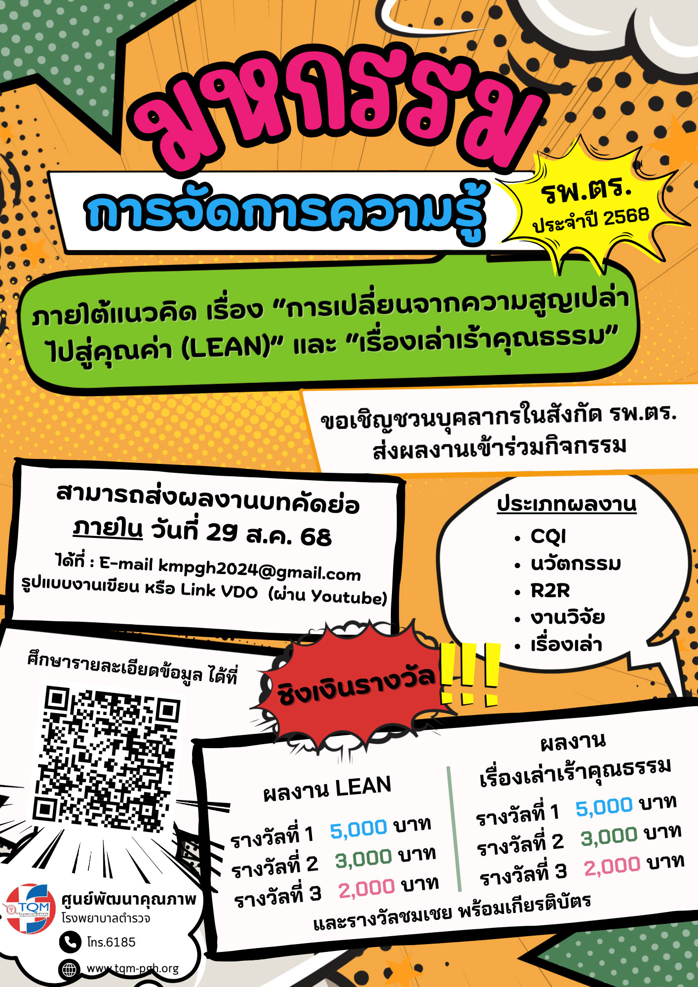 ขอเชิญชวนบุคลากรในสังกัดโรงพยาบาลตำรวจ ส่งผลงานเข้าร่วมกิจกรรม มหกรรมการจัดการความรู้ โรงพยาบาลตำรวจ ประจำปี 2568